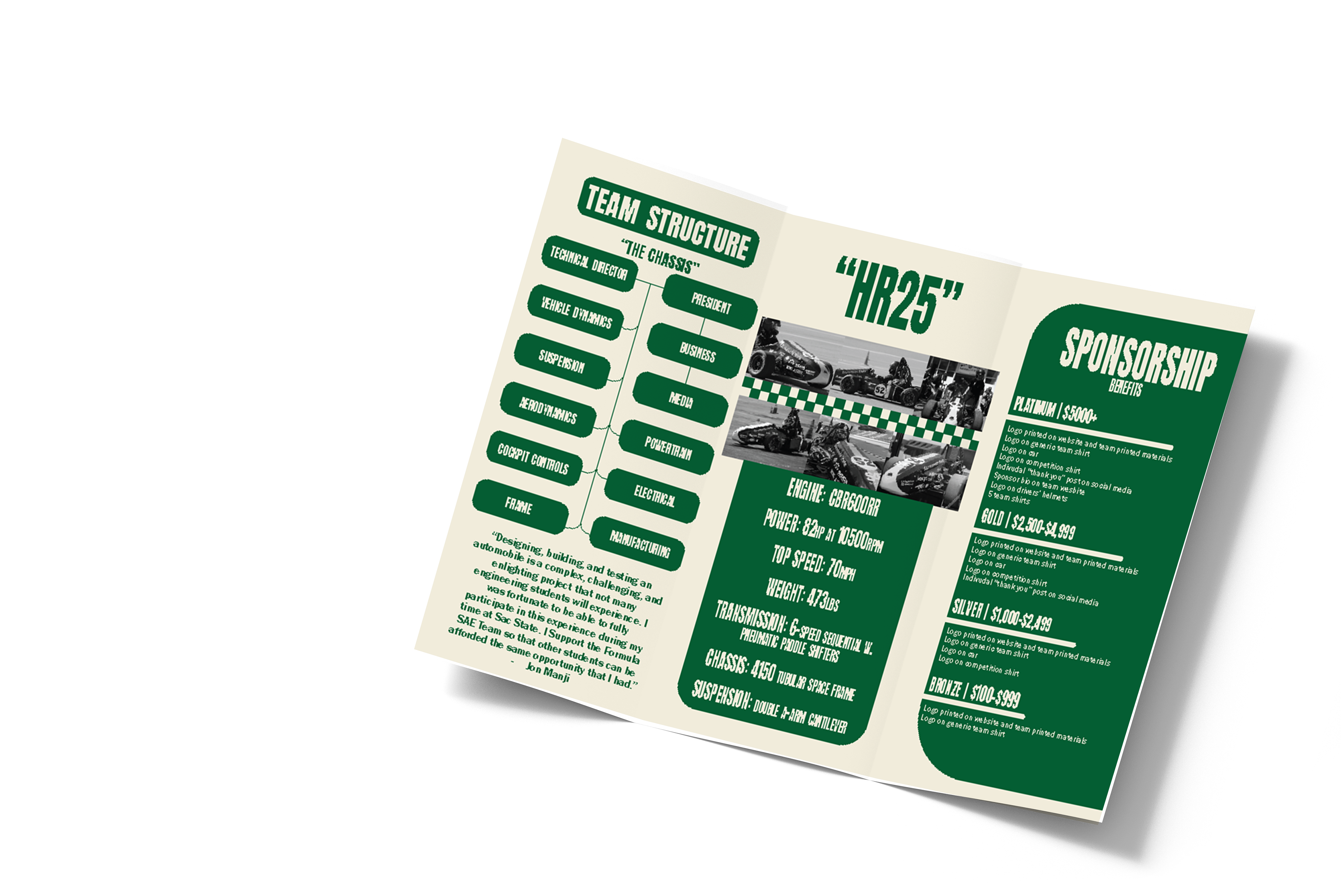 Creating this pamphlet required balancing visual identity with clear technical communication. The goal was to present Hornet Racing’s brand through our established colors while organizing detailed information about each subsystem in a way that remained accessible to potential sponsors.
